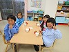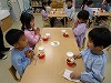 待ちに待ったお楽しみ会の日!日中保育園にもやっぱりサンタさんが来てくれて、お土産を戴きました✨ そしてお昼寝から目が覚めると、すぐさまスモックを身に付け、自分のオリジナルケーキ作りが始まりました💦 2種類のスポンジケーキ、フルーツ、ビスケット、ホイップクリーム、カラースプレーを好きなように飾り付け、ステキなケーキの出来上がり🎂 おいしく戴いて、カップについていたツリーを顔や手に貼って大喜びのぱんだサンタさん達でした❤