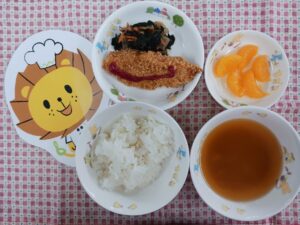 ≪昼食≫🍚御飯 🍚ささみのフィンガーフライ 🍚海藻サラダ 🍚味噌汁 🍚みかん缶