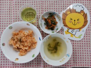 きょうのチキンライスは、鶏もも肉のほかに、玉ねぎ、人参が入っており、ケチャップとコンソメ、塩で味付けをしました。子ども達も進みがよく、喜んで食べていました☺