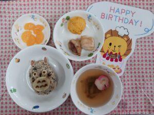 きょうは、トトロ御飯でした😋ひじき御飯をベースに、お腹と目はじゃがいも、目とお腹の内側の模様は、海苔の佃煮を用いてトトロを表現しました。可愛いキャラクターのご飯に、みんなとても喜んでいました👏