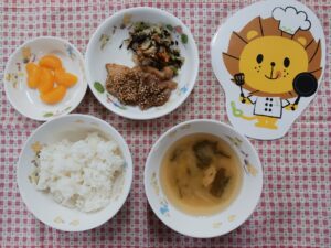 きょうの鶏肉のごま焼きは、鶏肉を砂糖、醤油、酒を合わせた調味液に漬け込み、ごまをたっぷりとかけて焼きました。子供たちも御飯が進んでいる様子でした😄